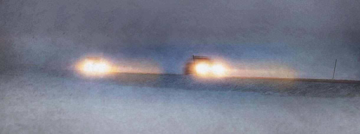 Att köra i snöyra gör det väldigt svårt för din hjärna att göra korrekta bedömningar, speciellt om du kör med helljus