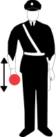 Minska hastigheten - Tecknet anger att den trafikant som polismannen är vänd mot ska minska hastigheten.