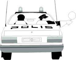 Kör in till vägkanten och stanna framför polisfordonet - Tecknet anger att föraren av det fordon som befinner sig framför polisfordonet ska köra in till vägkanten och stanna. Tecknet ges med växelvis blinkande blått och rött ljus.