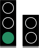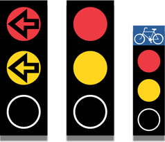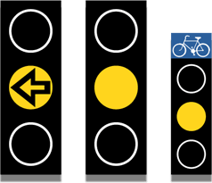 GröntGrönt betyder att du får fortsätta framåt. En grön pil innebär att signalen endast gäller den färdriktning som anges med pilen. Du får alltså köra i pilens riktning även om en annan signal (exempelvis rött) visas bredvid. |