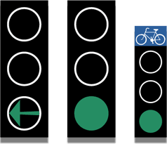 Extraljus Om huvudljuset visar grön signal och extraljuset är släckt (som på bilden) så gäller alltså den gröna signalen vilket innebär att du både får fortsätta framåt eller svänga i korsningen. Om huvudljuset visar röd signal och extraljuset är släckt så måste du stanna. Om huvudljuset visar röd signal och extraljuset visar en grön pil så får du endast svänga i pilens riktning. |