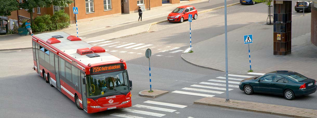 Oavsett vägens hastighetsbegränsning så måste du alltid passera stillastående bussar med stor försiktighet och god säkerhetsmarginal i sidled. Även om det är bussen som ska lämna företräde så måste du vara beredd på att kunna stanna eftersom risken finns att en fotgängare kliver ut i vägen framför bussen, där din sikt är skymd.