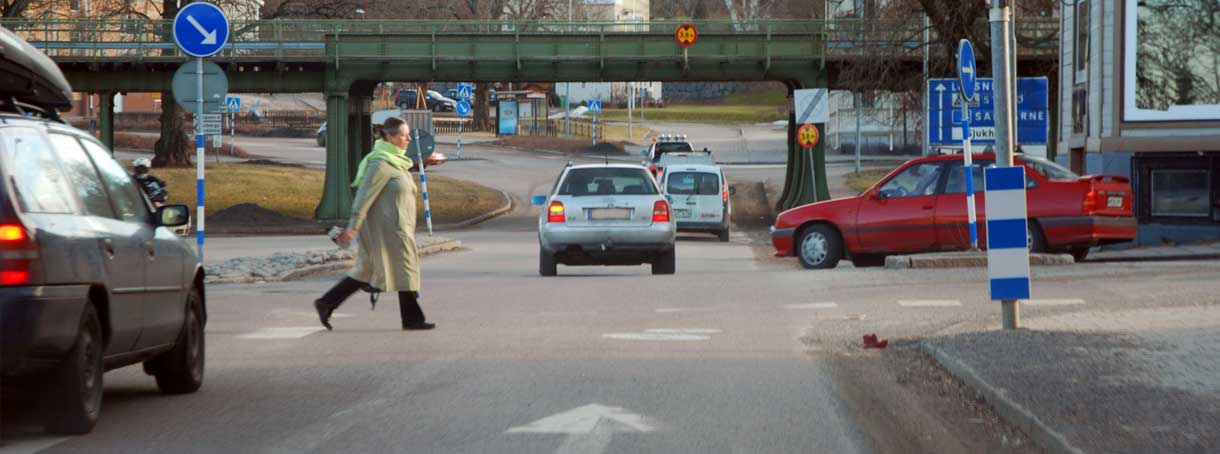 När du krypkör i köer måste du stanna innan korsningar, övergångsställen och cykelöverfarter så att du inte blir ståendes på ett sätt som hindrar korsande trafik, fotgängare och cyklister