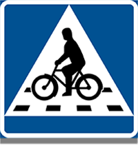 CykelöverfartAnger en cykelöverfart. Om cykelöverfarten är obevakad, alltså att den inte är utrustad med fungerande trafikljus, så har du väjningsplikt mot cyklister och mopedister som korsar eller ska korsa cykelöverfarten. |
