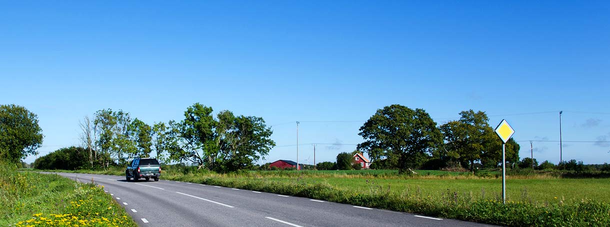 Det gula rombformade vägmärket anger att vägen är en huvudled