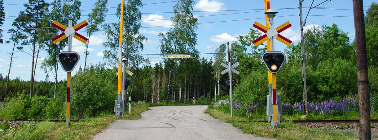 Kontrollera alltid själv att inget tåg kommer innan du passerar ett järnvägs- eller spårvägsspår