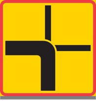 Tavlan visar en stiliserad version av den kommande korsningen, där du kommer nerifrån och den väg som inte har väjningsplikt markeras med ett tjockare streck än övriga vägar.