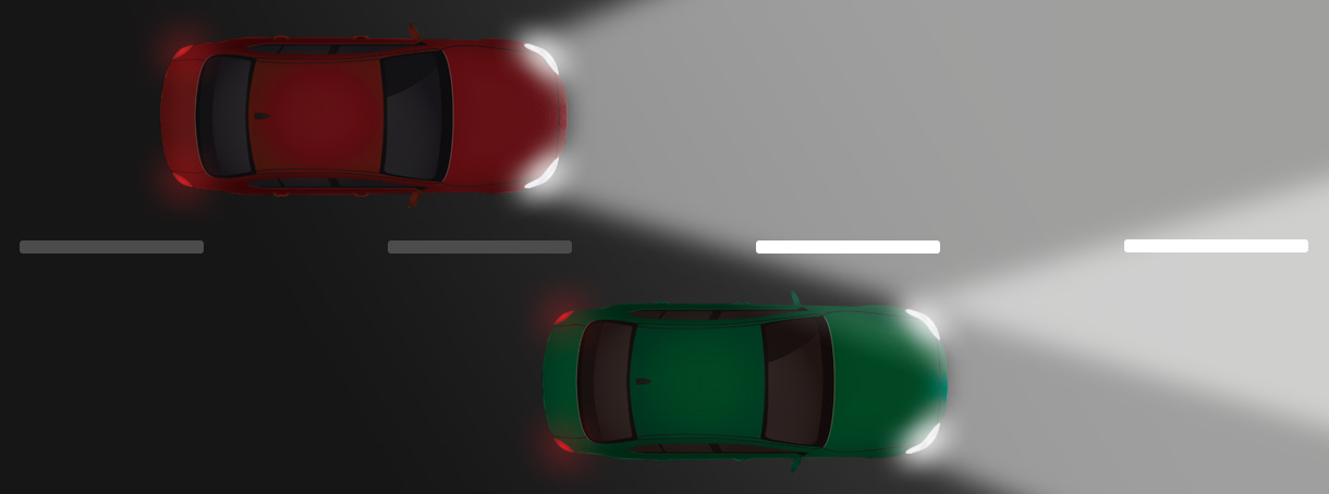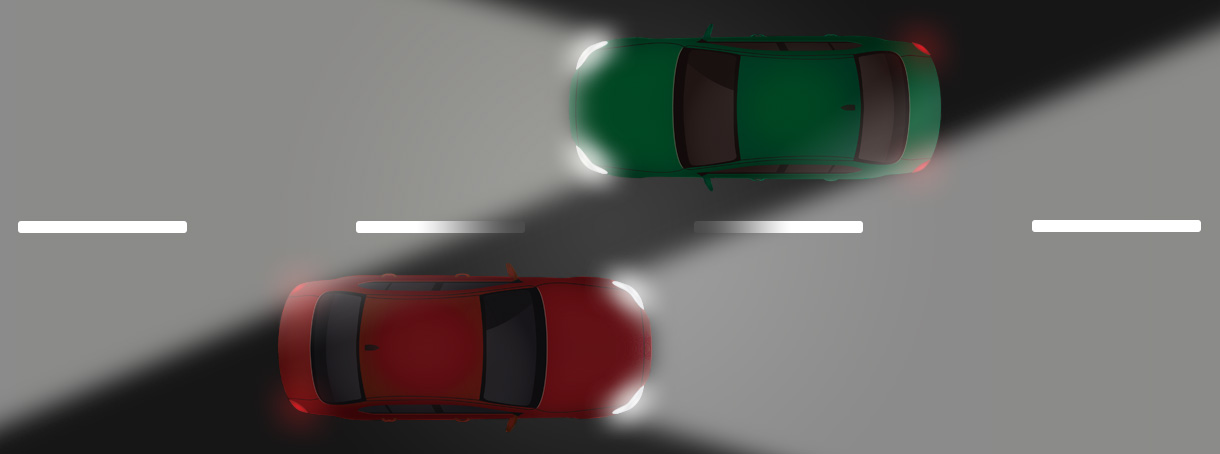 Det kan vara svårt att avgöra på vilket avstånd du ska blända av, men du kan tänka att målet är att blända av ungefär när din bils och det mötande fordonets strålkastare tillsammans belyser vägsträckan mellan er.