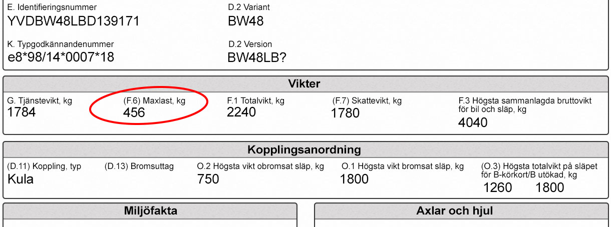 Om du ska köra bilen som registreringsbeviset ovanför tillhör och ska ta med en passagerare som väger 80 kg så får du ta med högst 376 kg annan last eftersom 456 kg - 80 kg = 376 kg